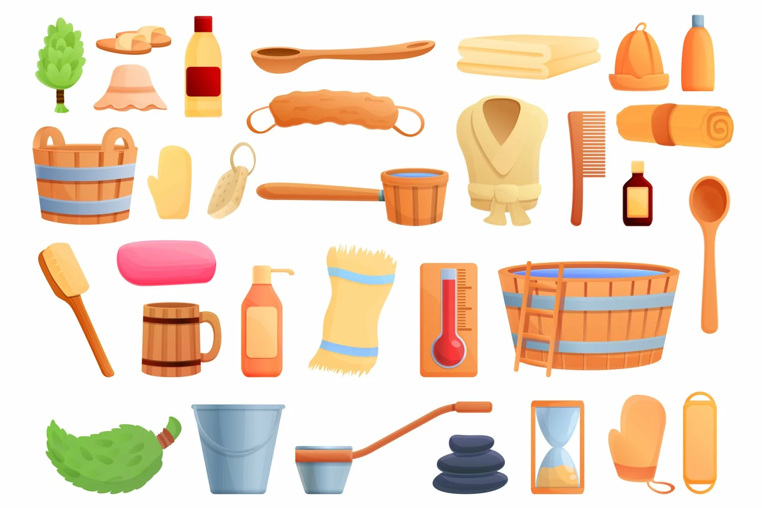 Sauna icons set. Cartoon set of sauna vector icons for web design