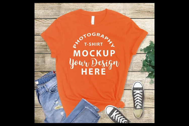 These kinds of mock-ups with an attractive wooden background, sport shoes and blue jeans are perfect for those who create T-shirts and are suitable for any online store.