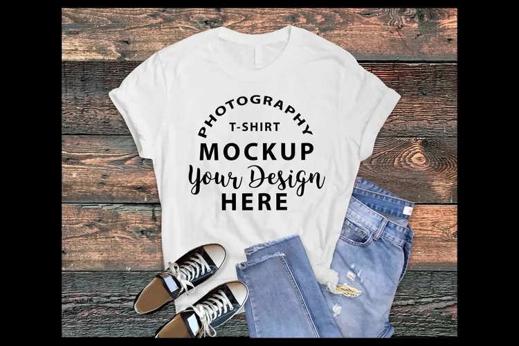 These kinds of mock-ups with an attractive wooden background, sport shoes and blue jeans are perfect for those who create T-shirts and are suitable for any online store.