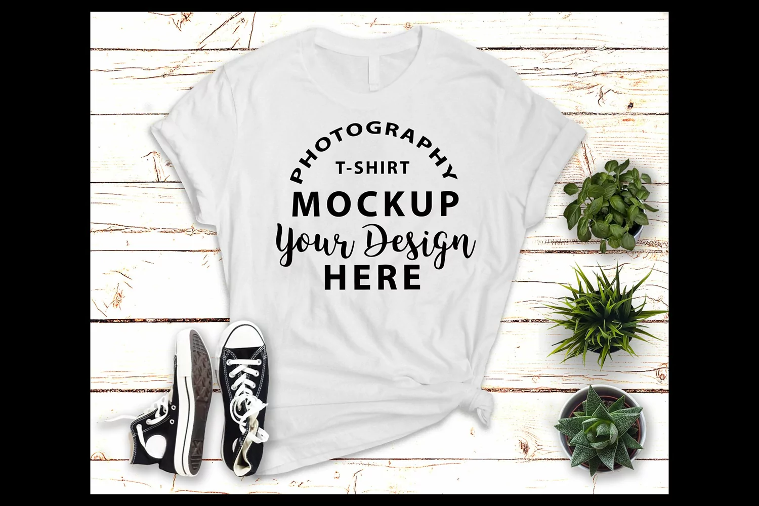 These kinds of mock-ups with a wooden background, sport shoes, cell phone and plant are perfect for those who create T-shirts and are suitable for any online store.