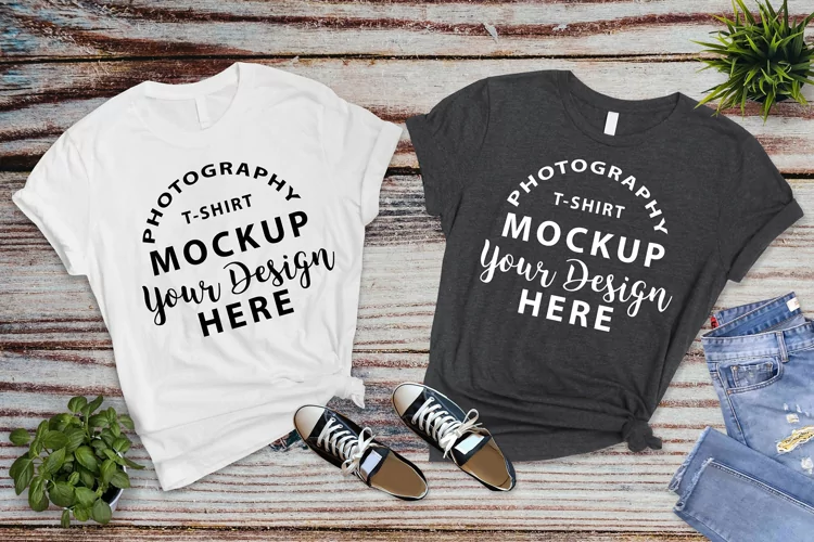 These kinds of mock-ups with an attractive wooden background, sport shoes, and plants are perfect for those who create T-shirts and are suitable for any online store.