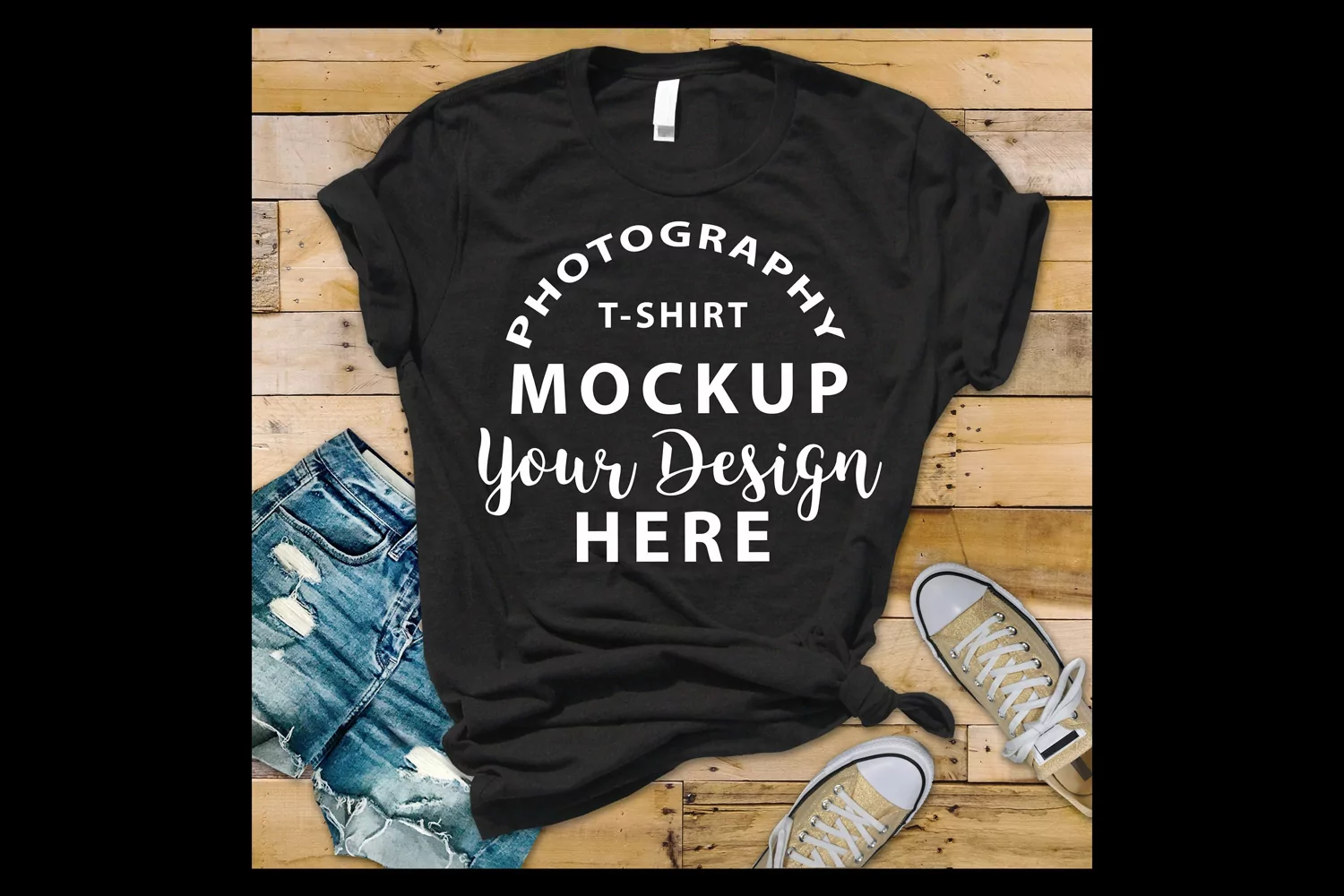 Attractive photography mock-up with beautiful wooden background, jeans and sport shoes.