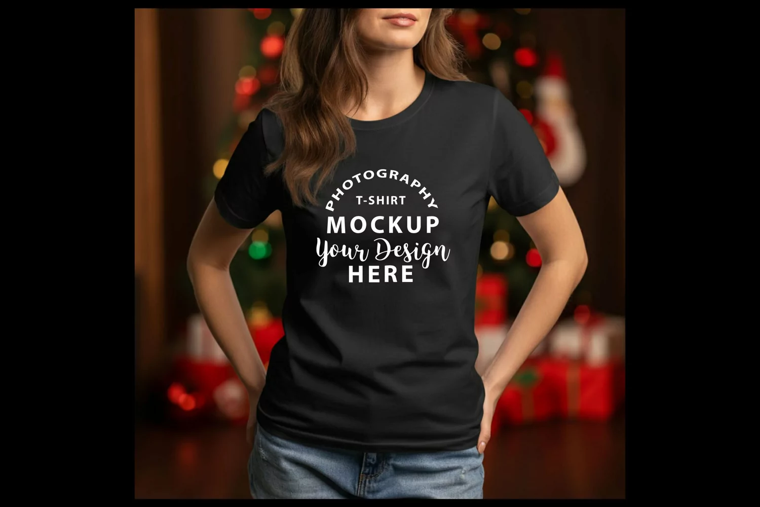 A well-crafted t-shirt mockup for showcasing designs with clarity and precision, allowing the artwork to stand out while accurately representing how it would look on the actual shirt. The mockup uses realistic lighting and shading to capture the texture and flow of the material, enhancing the visibility of the design’s colors, contrast, and placement. By offering actual angle and a festive Christmas background, the mockup ensures the focus remains on the design, making it ideal for presentations, marketing, or online stores.