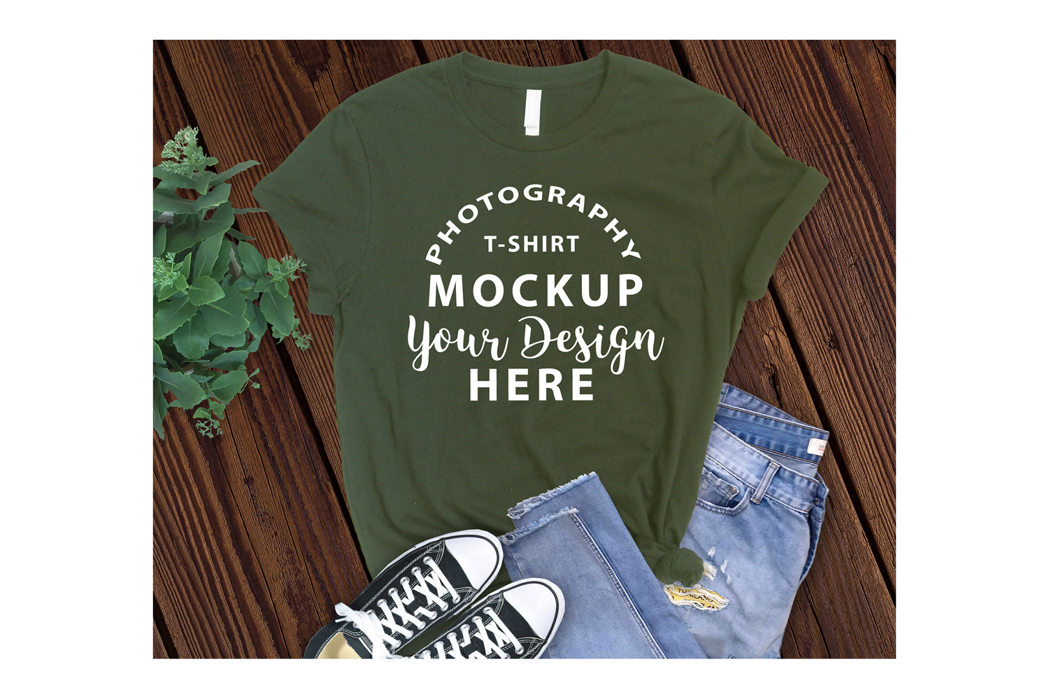 Dark wooden background adding a rustic charm to the scene. The t-shirt is paired with torn jeans, sneakers and plant , creating a stylish and casual look that appeals to a wide audience.