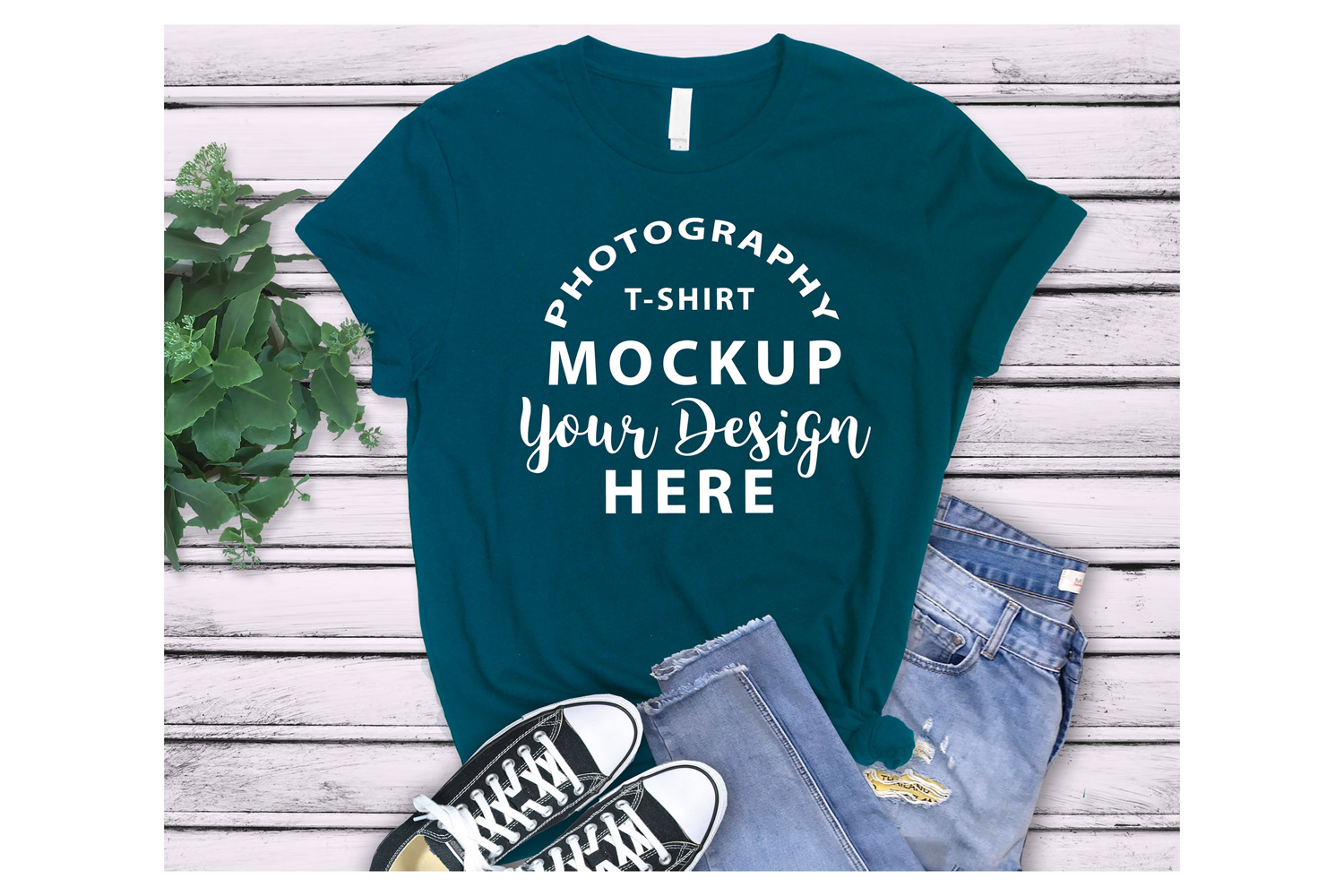 Presentation Promotional Flat Lay Product Mockup Print On Demand Photography Mockup T-shirt Mockup Life Style Deep Teal Bella Canvas 3001 Mockup
