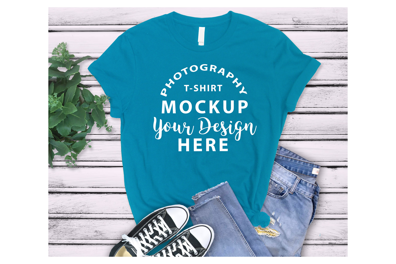 Presentation Teal Promotional Flat Lay Product Mockup Print On Demand Photography Mockup T-shirt Mockup Life Style Bella Canvas 3001 Mockup
