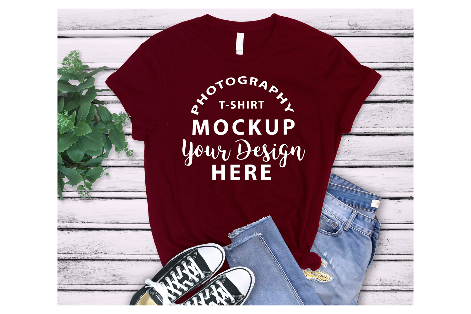 Presentation Promotional Flat Lay Product Mockup Maroon Print On Demand Photography Mockup T-shirt Mockup Life Style Bella Canvas 3001 Mockup