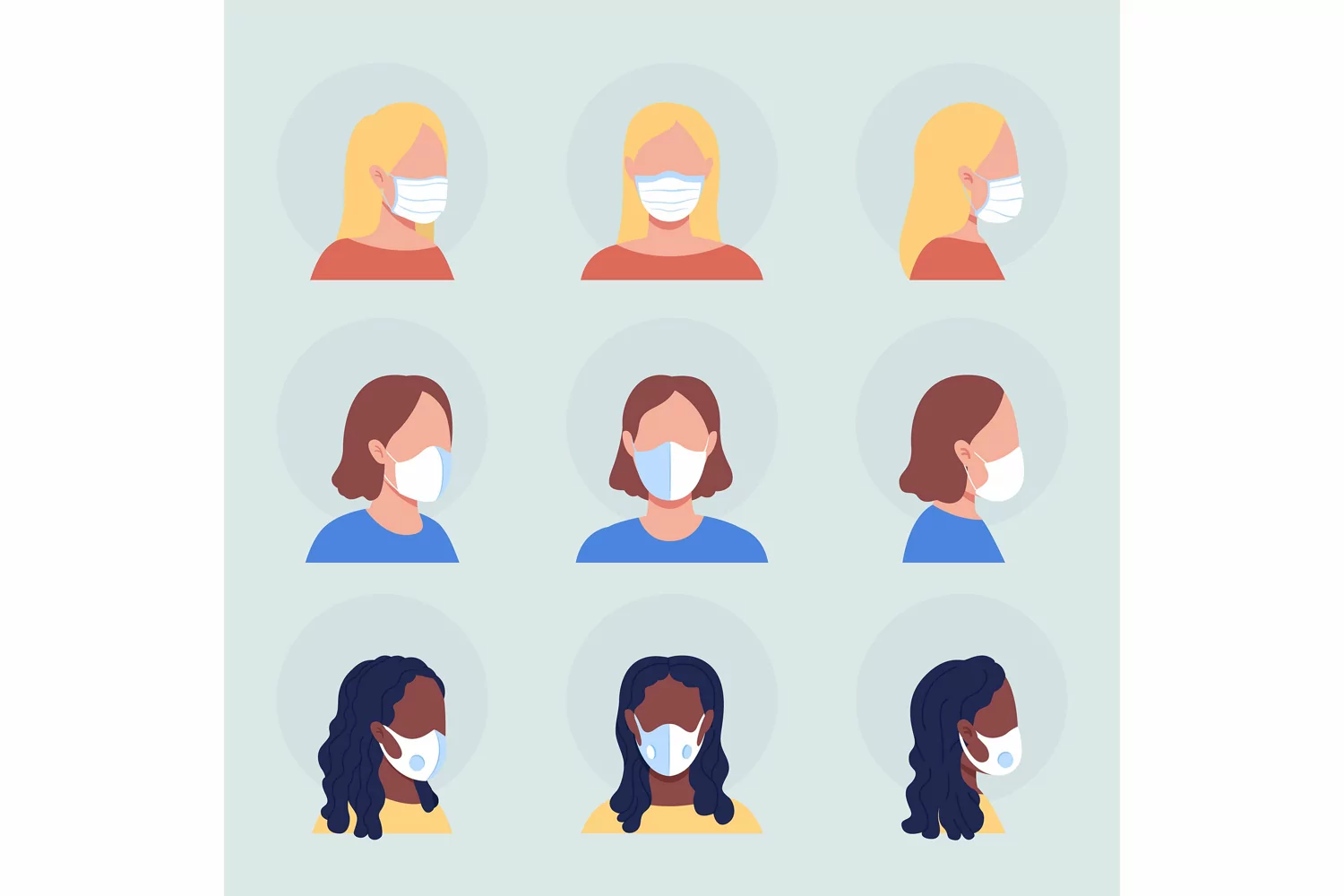 Ladies with white masks semi flat color vector character avatar set. Portrait with respirator from front and side view. Isolated modern cartoon style illustration for graphic design and animation pack