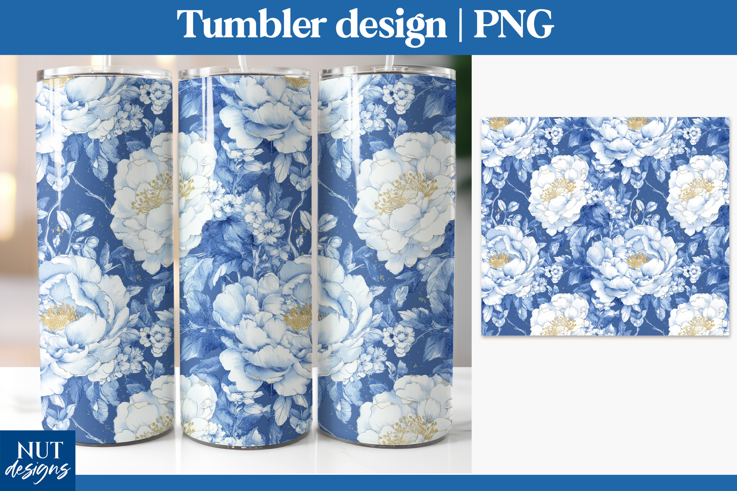 Elegant chinoiserie peony floral tumbler wrap in classic blue and white—perfect for stylish 20oz drinkware, gifts, or sublimation crafting.Peony background is perfect for creating elegant and personalized tumbler sublimation projects.