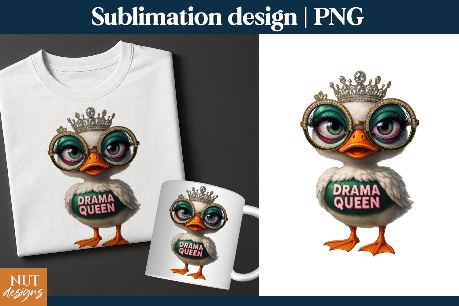 Sassy duck with crown and “Drama Queen” tee—perfect for fun shirts, mugs, or gifts for moms, coworkers, or the queen of extra.