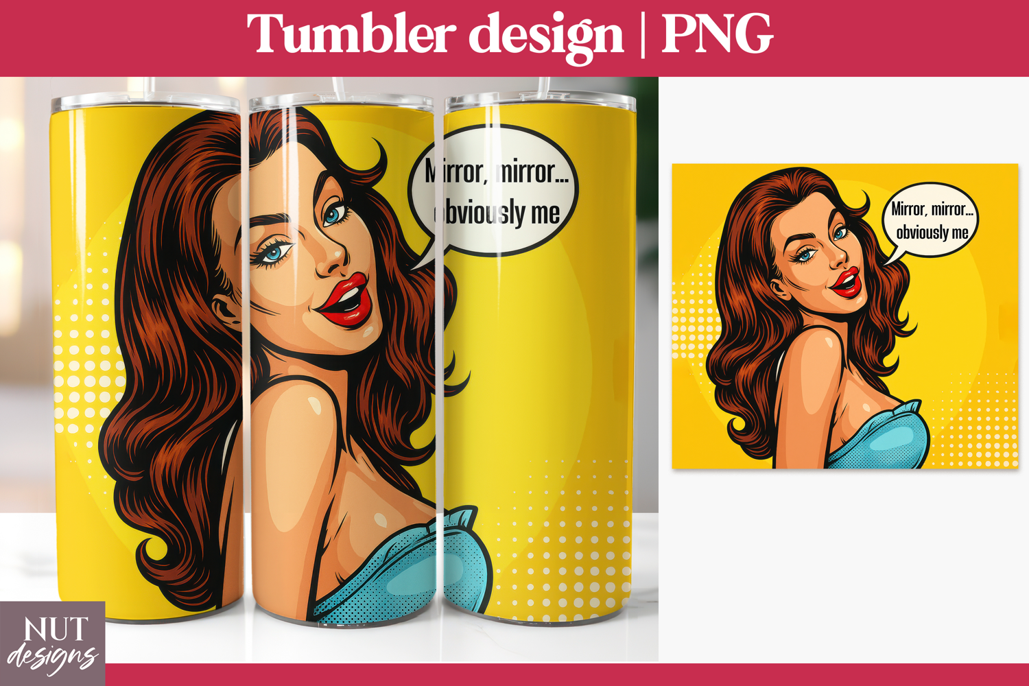 Bold pop art tumbler wrap featuring a dramatic comic-style girl and “Mirror, mirror.... obviously me” quote, perfect for sarcastic bestie gifts or fun, expressive drinkware.