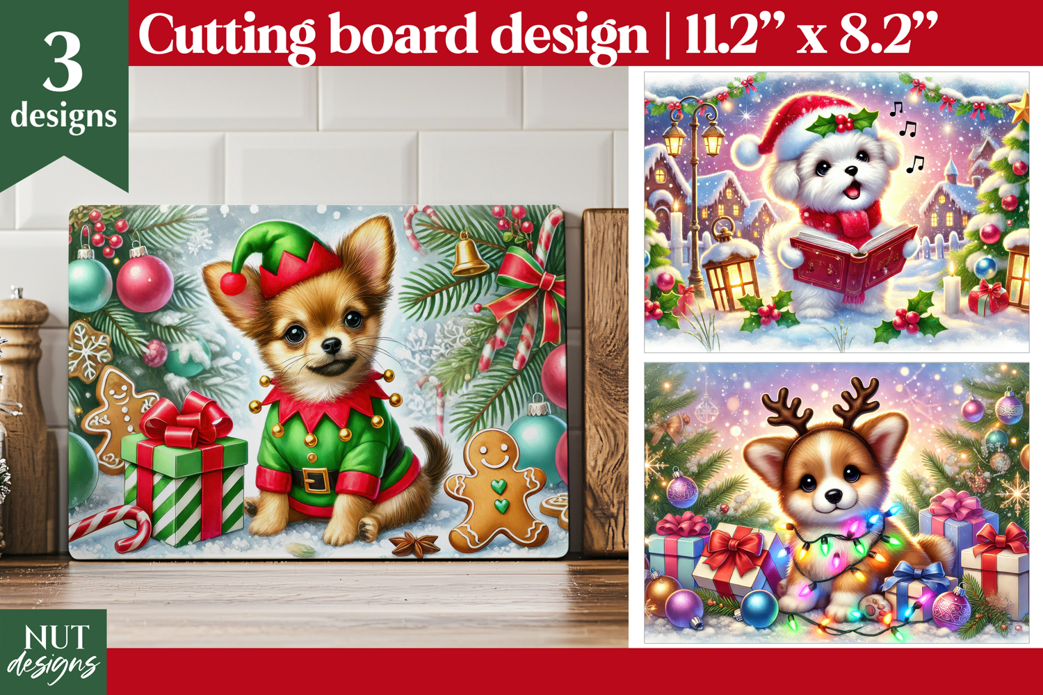 Adorable Christmas cutting board designs featuring festive puppies dressed as an elf, reindeer, and caroler. Perfect for holiday kitchens, baking decor, pet lover gifts, and seasonal displays. Add charm to your kitchen with these cheerful dog boards.