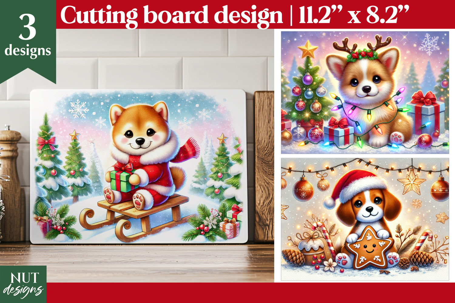 Adorable Christmas cutting board designs featuring festive puppies dressed as a reindeer, with cookies and with gift. Perfect for holiday kitchens, baking decor, pet lover gifts, and seasonal displays. Add charm to your kitchen with these cheerful dog boards.