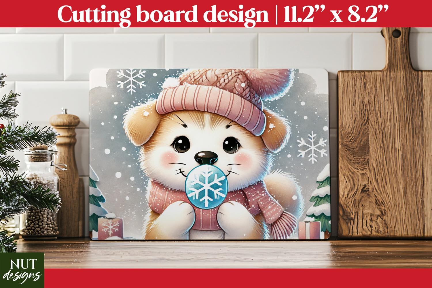 Add cozy charm to your kitchen with this winter puppy cutting board design! Featuring a sweet dog in a hat with a snowflake treat, it's perfect for seasonal decor, pet lovers, holiday gifts, and festive winter-themed baking and crafting spaces.