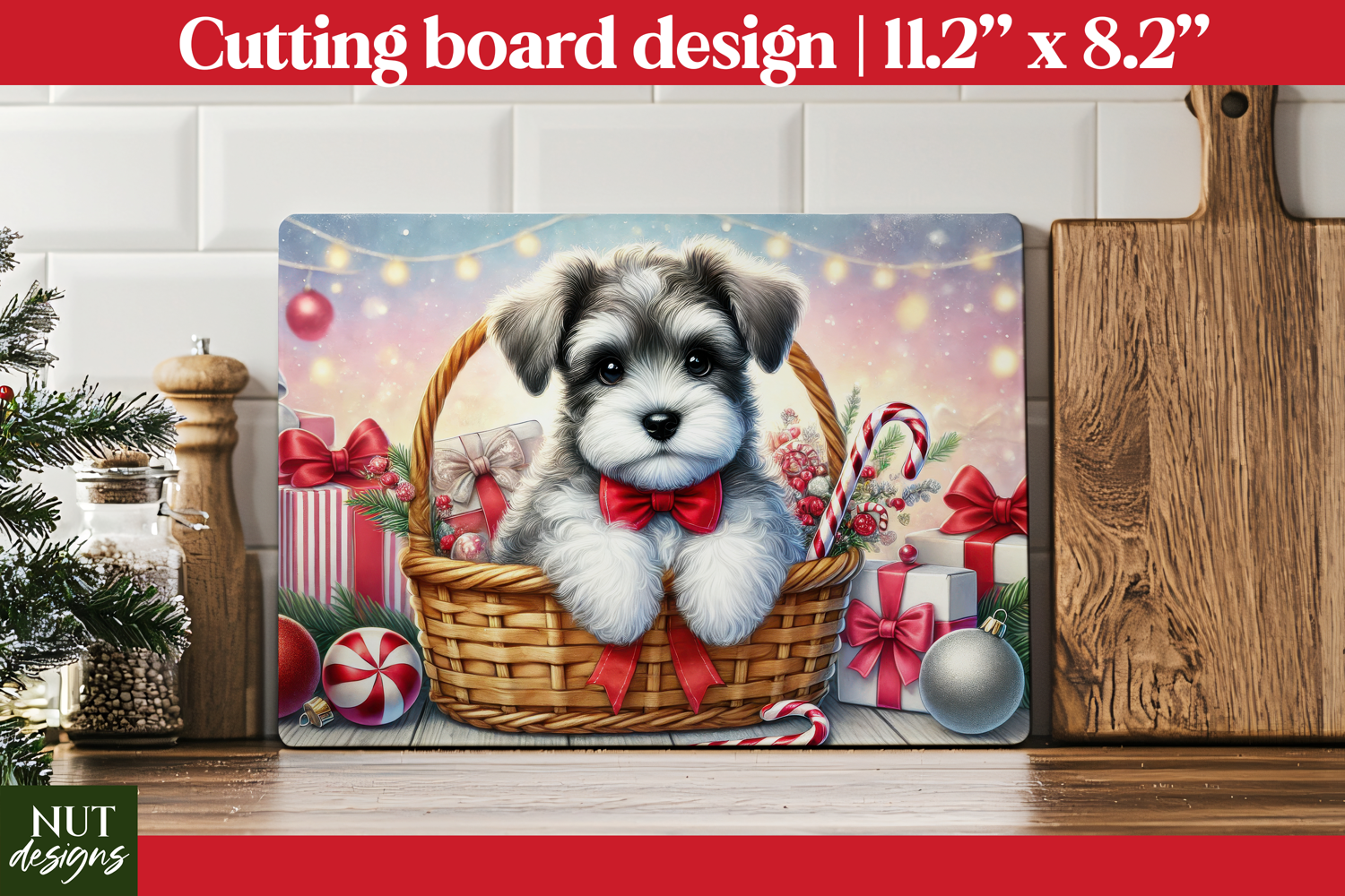 Holiday Dog Kitchen Decor Christmas Puppy Basket Cutting Board Festive Puppy Printable Board Cute Pet Lover Gift Idea Candy Cane Dog Kitchen Art Christmas Gift Dog Design Adorable Holiday Pet Decor Dog Basket Christmas Board Winter Kitchen Puppy Board Red Bow Puppy Kitchen Gift