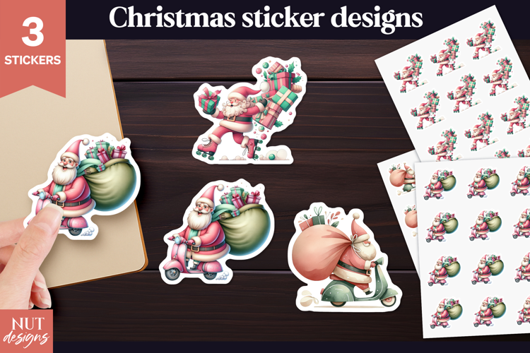 These Santa on wheels sticker designs feature festive illustrations of Santa riding scooters and roller skates with gift sacks. Perfect for holiday planners, crafts, cards, and printables. Add charm and humor to your Christmas sticker collection!