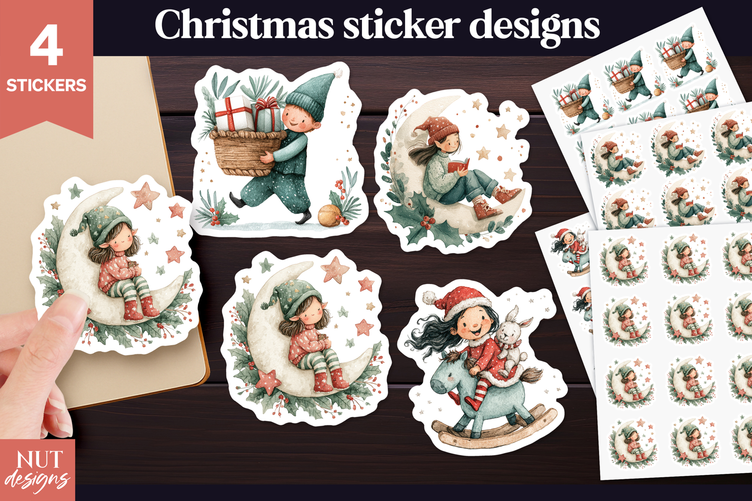 These adorable Christmas stickers feature cozy children and elves riding horses, sitting on moons, reading, and carrying gifts. Perfect for planners, scrapbooking, and holiday crafts. Add charm with these soft, storybook-style printables!