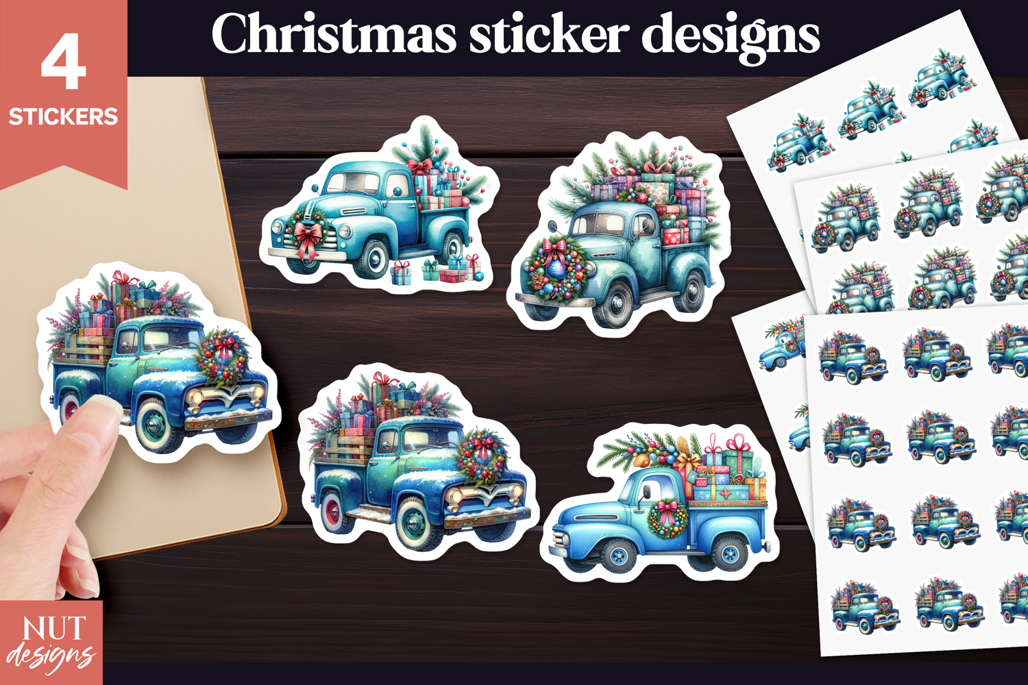 This Christmas truck sticker pack features vintage blue pickups filled with wrapped gifts, wreaths, and holiday greenery. Perfect for journaling, gift tags, scrapbooking, and seasonal crafts. High-resolution PNG printables included.