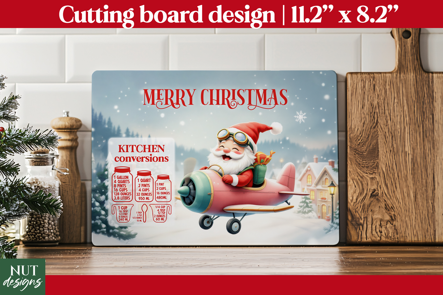 Add festive cheer to your kitchen with this Christmas Santa cutting board featuring handy kitchen conversions. Perfect for holiday cooking, it’s a cute and functional gift idea that brings joyful Christmas decor and baking charm to your home.