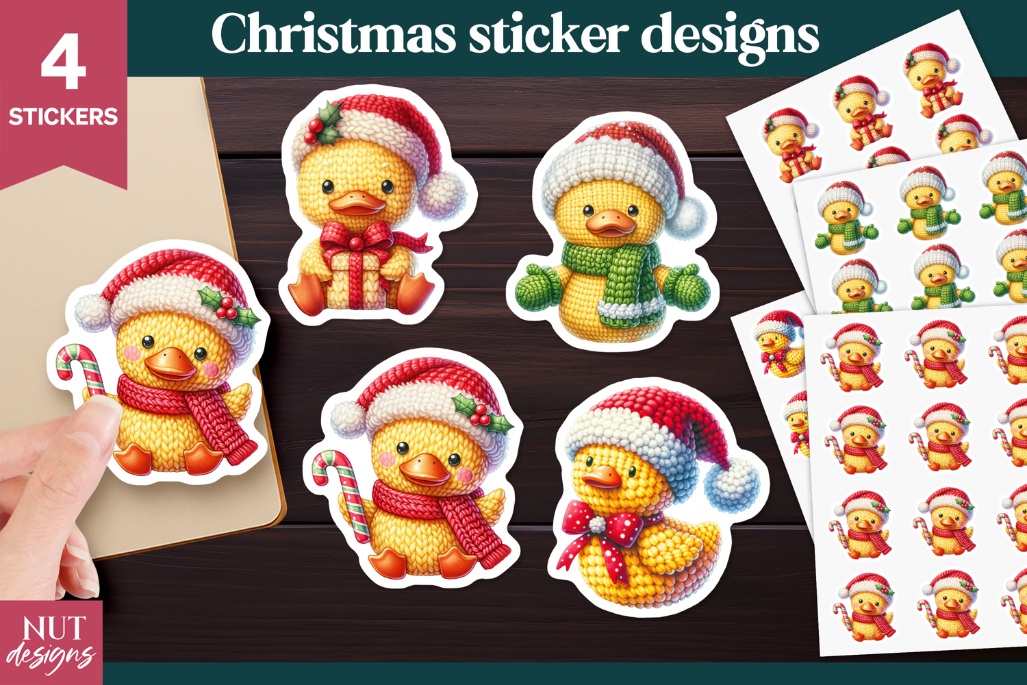 Adorable knitted Christmas duck stickers with cozy textures, Santa hats, and festive scarves. Perfect for planners, cards, and crafts. Add warmth and cheer to your holiday projects with these cute printable festive duck sticker designs.