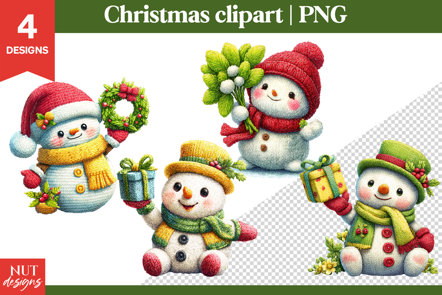 Adorable knitted Christmas snowman clipart set with cozy yarn textures, colorful scarves, and festive details. Perfect for cards, crafts, and winter projects. Add warmth and handmade charm to your Christmas designs with these cute knitted snowmen.