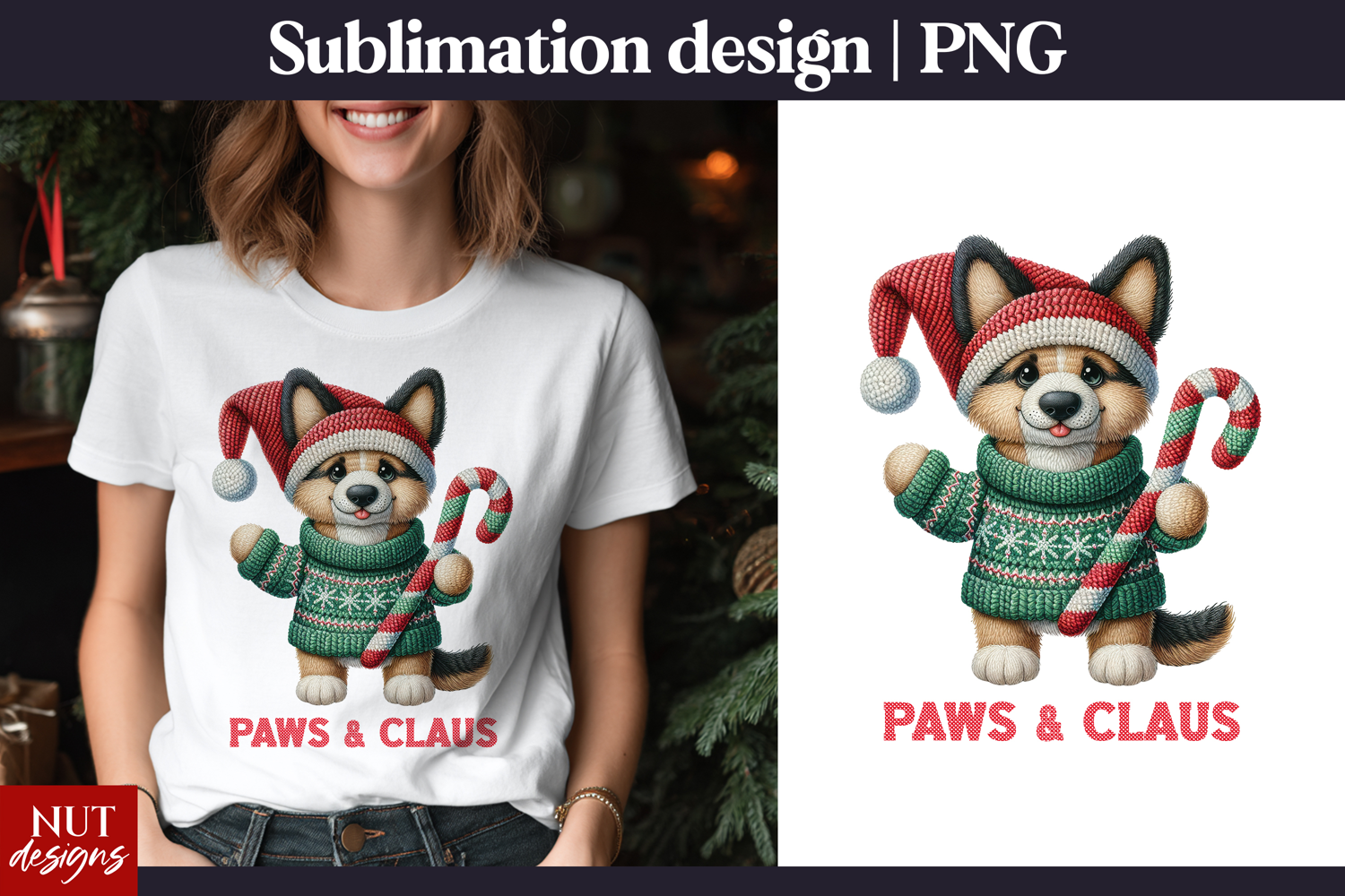 This adorable “Paws & Claus” Christmas dog sublimation PNG features a festive puppy in a sweater and Santa hat, perfect for shirts, mugs, totes, and holiday decor. Ideal for dog lovers and crafters looking for cute winter digital designs.