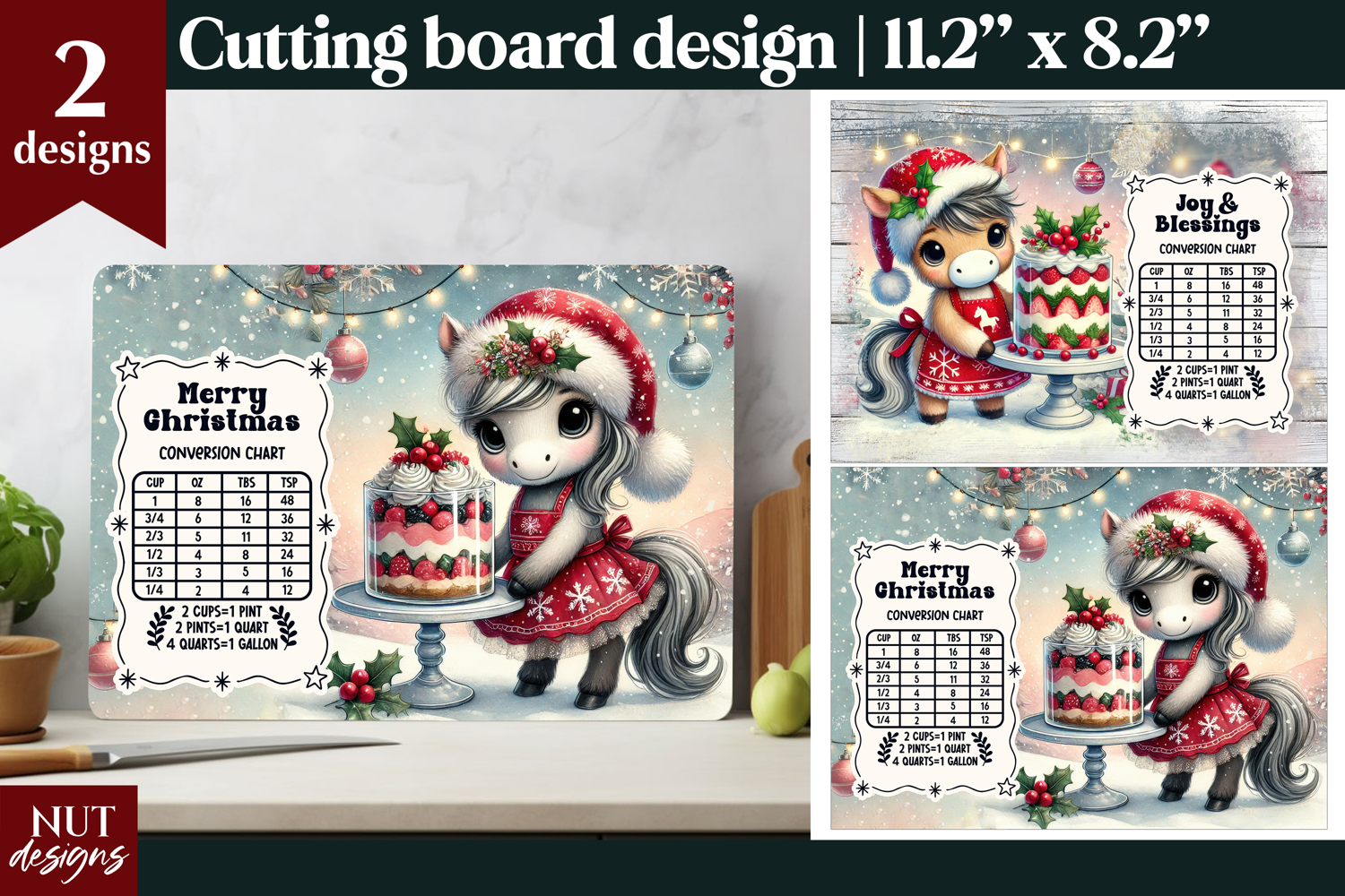 This adorable Christmas pony cutting board design features two festive ponies in red aprons presenting holiday cakes alongside a handy baking conversion chart. Perfect for sublimation or printable crafts, these 11.2" x 8.2" PNG designs make charming kitchen decor, thoughtful gifts for bakers, or festive DIY projects. With cute pony characters and wintry charm, this baking-themed clipart adds both cheer and function to your holiday creations.