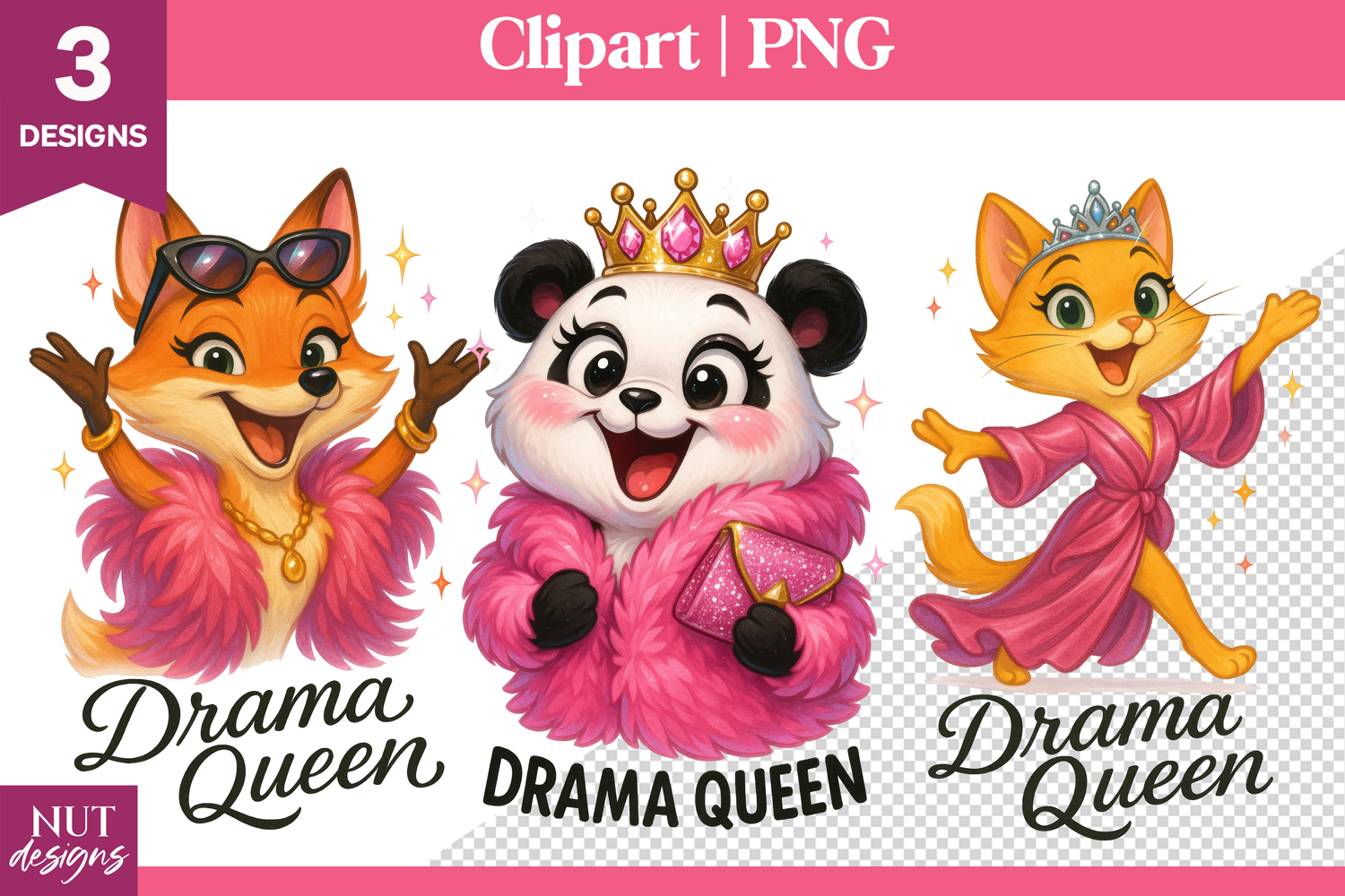 Bring bold attitude and fabulous flair to your designs with this Drama Queen Animal Clipart PNG set! Featuring a glamorous fox, a sparkling panda, and a fabulous cat all dressed in pink robes, crowns, and accessories, these high-quality PNGs are perfect for planners, t-shirts, party invites, sublimation, and more. Add sparkle and sass to your creative projects with these diva animals ready to rule the scene with their dramatic style and adorable charm.