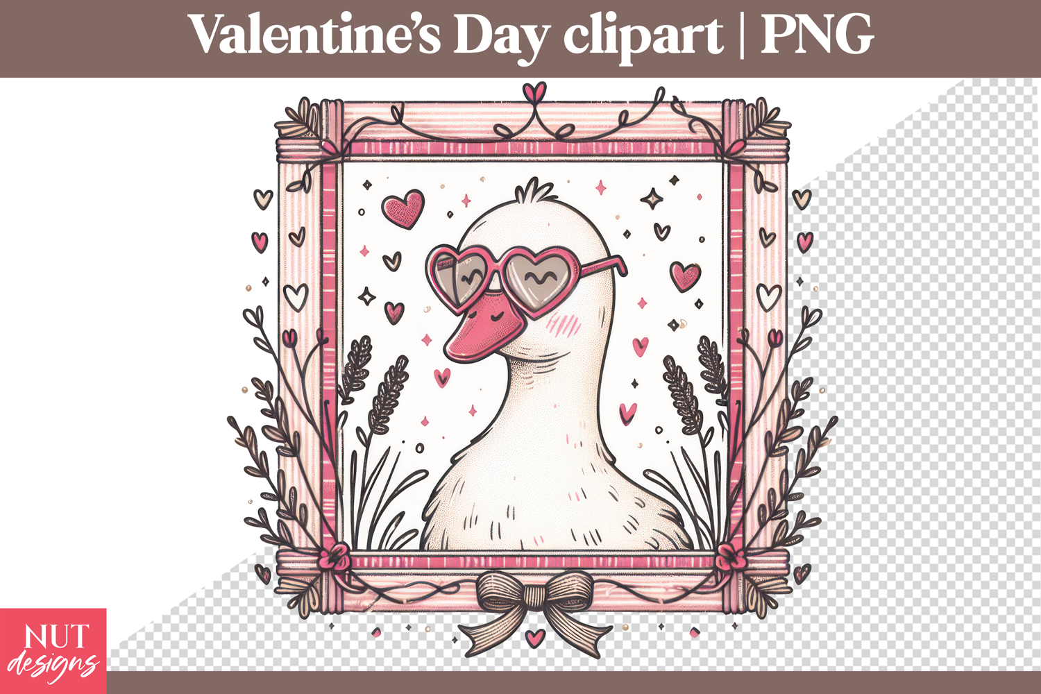 This whimsical Valentine goose clipart features a charming goose with heart-shaped glasses, surrounded by a rustic floral frame and floating hearts. Hand-drawn in soft pastel tones, it's perfect for Valentine's Day cards, farmhouse-themed printables, and cozy romantic crafts. With its transparent background and playful design, this PNG adds a sweet country touch to digital downloads, DIY projects, and decor. Ideal for crafters who love rustic charm and cute animal illustrations.