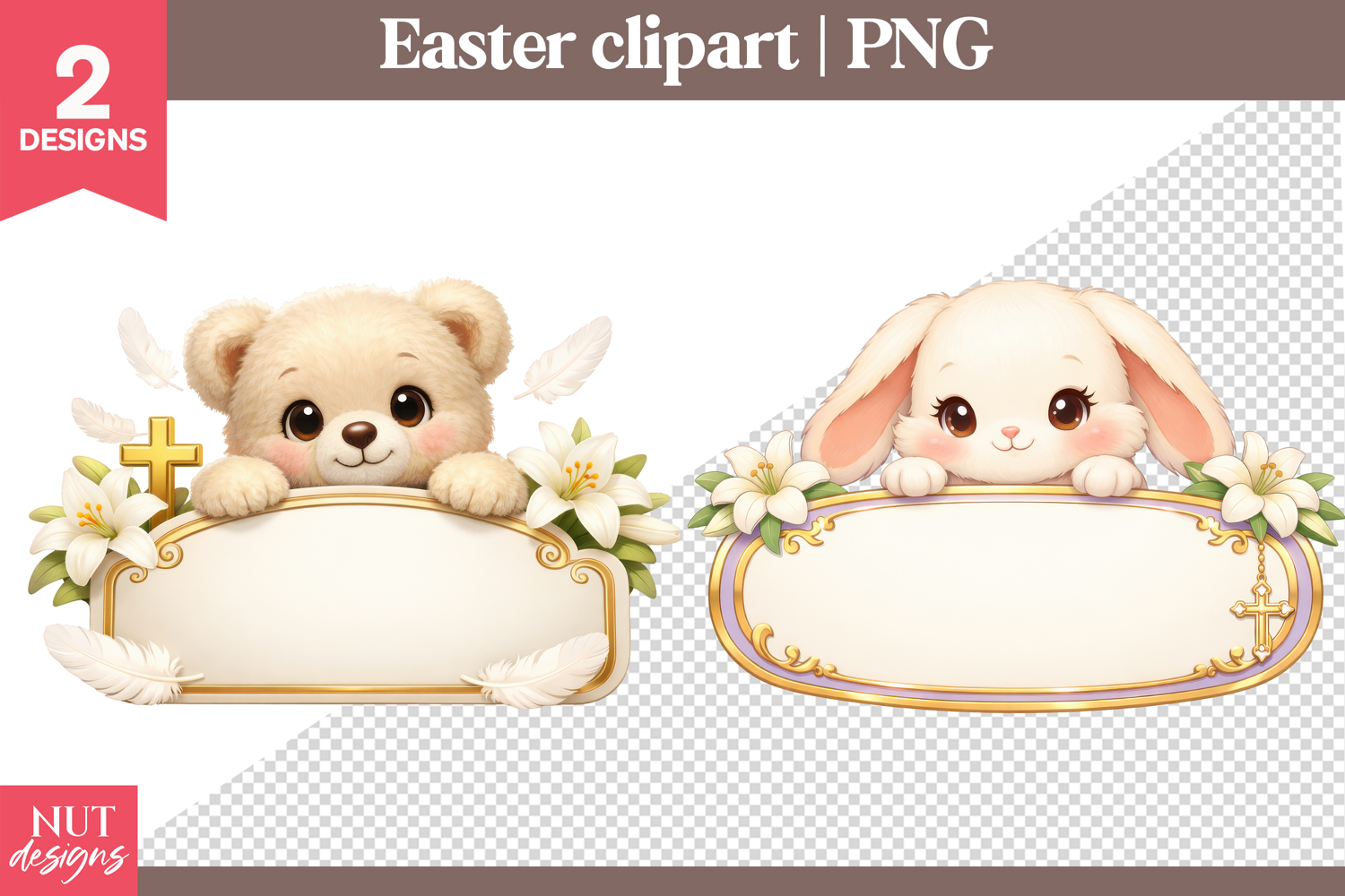 Celebrate spring with this Easter Name Sign Clipart PNG set featuring an adorable bunny and bear with floral accents, lilies, and Christian crosses. These blank pastel labels are perfect for adding custom names or messages to cards, classroom tags, Easter baskets, church programs, or digital scrapbooks. Designed in a cute and soft style, they’re ideal for faith-based crafts and Easter-themed DIY projects.