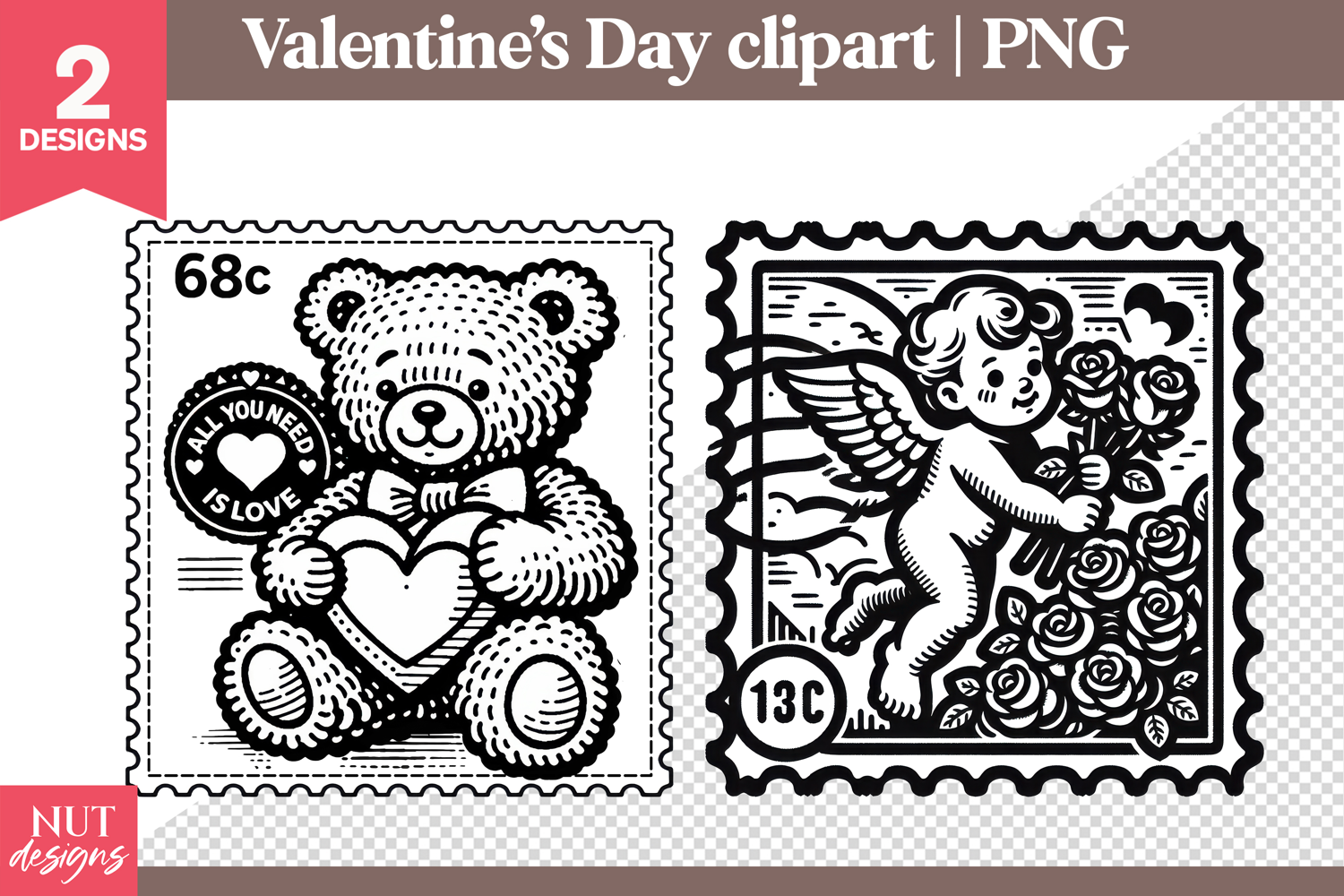 This Retro Valentine Stamp Clipart PNG set features two charming black-and-white designs—a sweet teddy bear holding a heart with “All You Need Is Love” and a flying cupid delivering roses. With bold vintage styling and detailed linework, these printable stamp illustrations are perfect for Valentine’s Day crafts, cards, mail-themed designs, and romantic decor. Ideal for crafters and designers looking to add nostalgic charm to their love-themed projects.