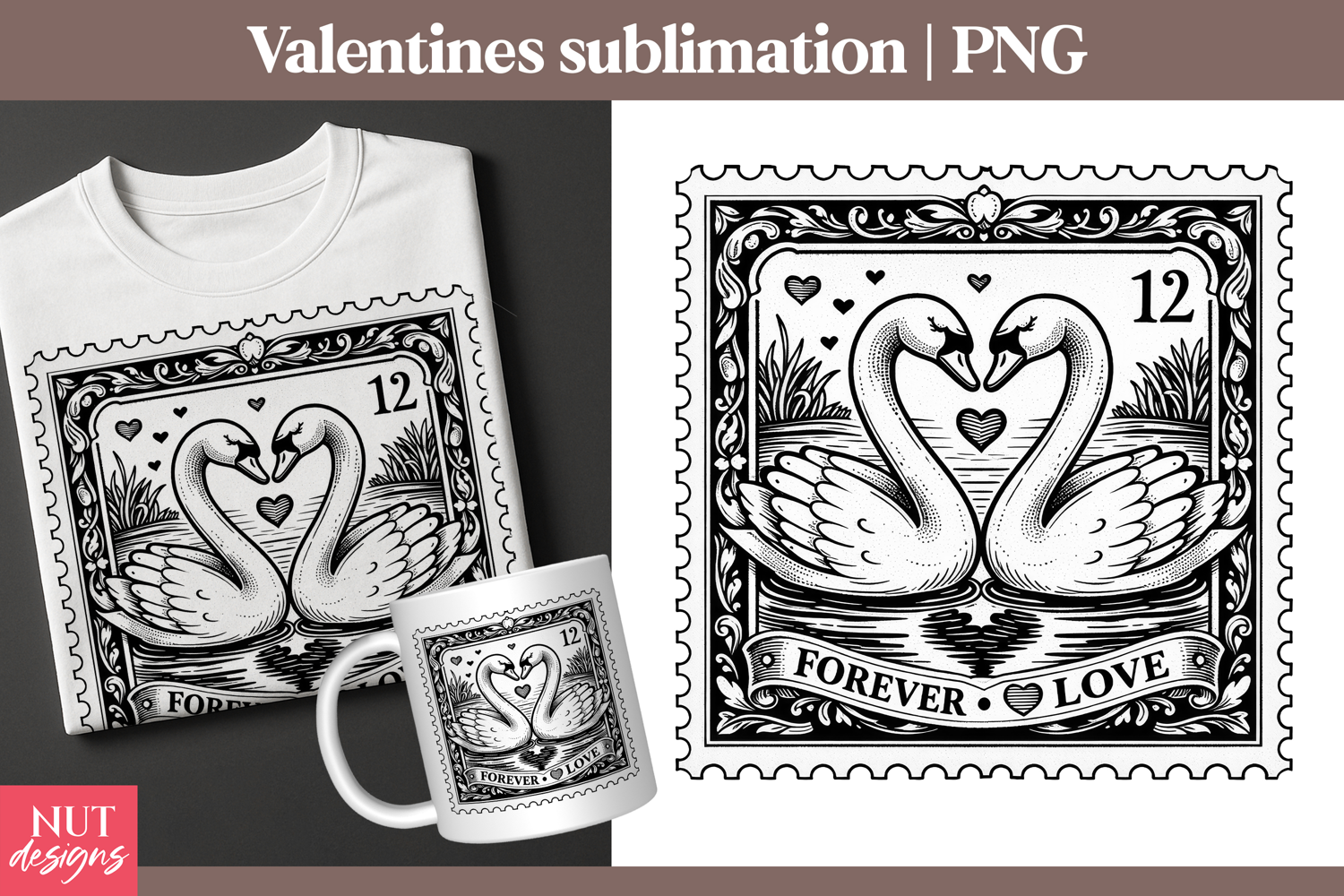 This Swan Love Forever Sublimation PNG features a beautifully detailed black-and-white vintage stamp design of two swans forming a heart with their necks above a calm pond. Surrounded by hearts and ornate framing, the "Forever Love" message makes it perfect for romantic Valentine’s Day sublimation projects, wedding gifts, or printable decor. Ideal for shirts, mugs, and cards, this elegant clipart brings timeless charm to love-themed creations.