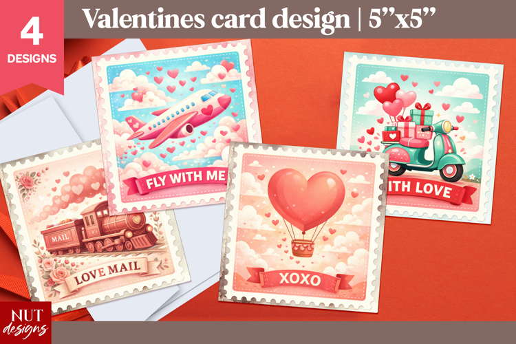 These Valentine Travel Card Designs in PNG format feature four adorable 5"x5" illustrations: a pink plane, heart balloon, vintage train, and gift scooter—each styled as a romantic postage stamp. Perfect for Valentine's Day greeting cards, digital designs, DIY crafts, and gift tags. The pastel colors and heart-filled skies make them ideal for love-themed creations. Add charm and whimsy to your projects with these high-resolution printable card cliparts.