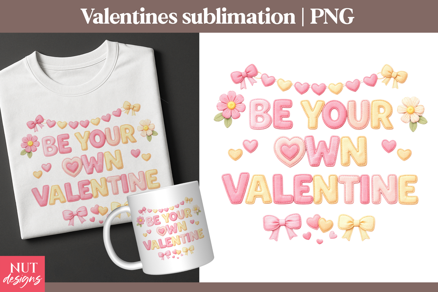 Celebrate love for yourself with this “Be Your Own Valentine” PNG sublimation design! Featuring stitched pink and yellow text, heart and bow accents, and floral details, it's a perfect message of empowerment and joy. Ideal for Valentine’s shirts, mugs, or uplifting gifts, this design blends sweetness with self-confidence. Great for anyone wanting to spread positive vibes with a trendy and feminine touch.