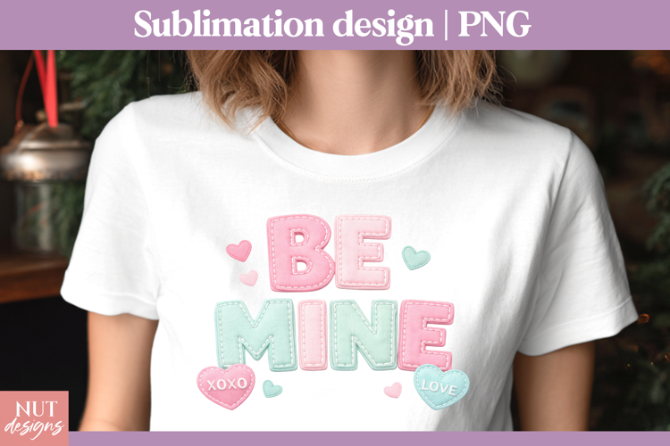This adorable “Be Mine” sublimation design features stitched pastel letters and candy heart accents in pink, mint, and blue. Perfect for Valentine's Day t-shirts, DIY apparel, or gift projects, this high-quality PNG file brings a sweet and romantic touch to your designs. Ideal for creating handmade clothing, personalized couple tees, or cute holiday merch. Celebrate love with soft colors and charming heart details in a printable digital format.