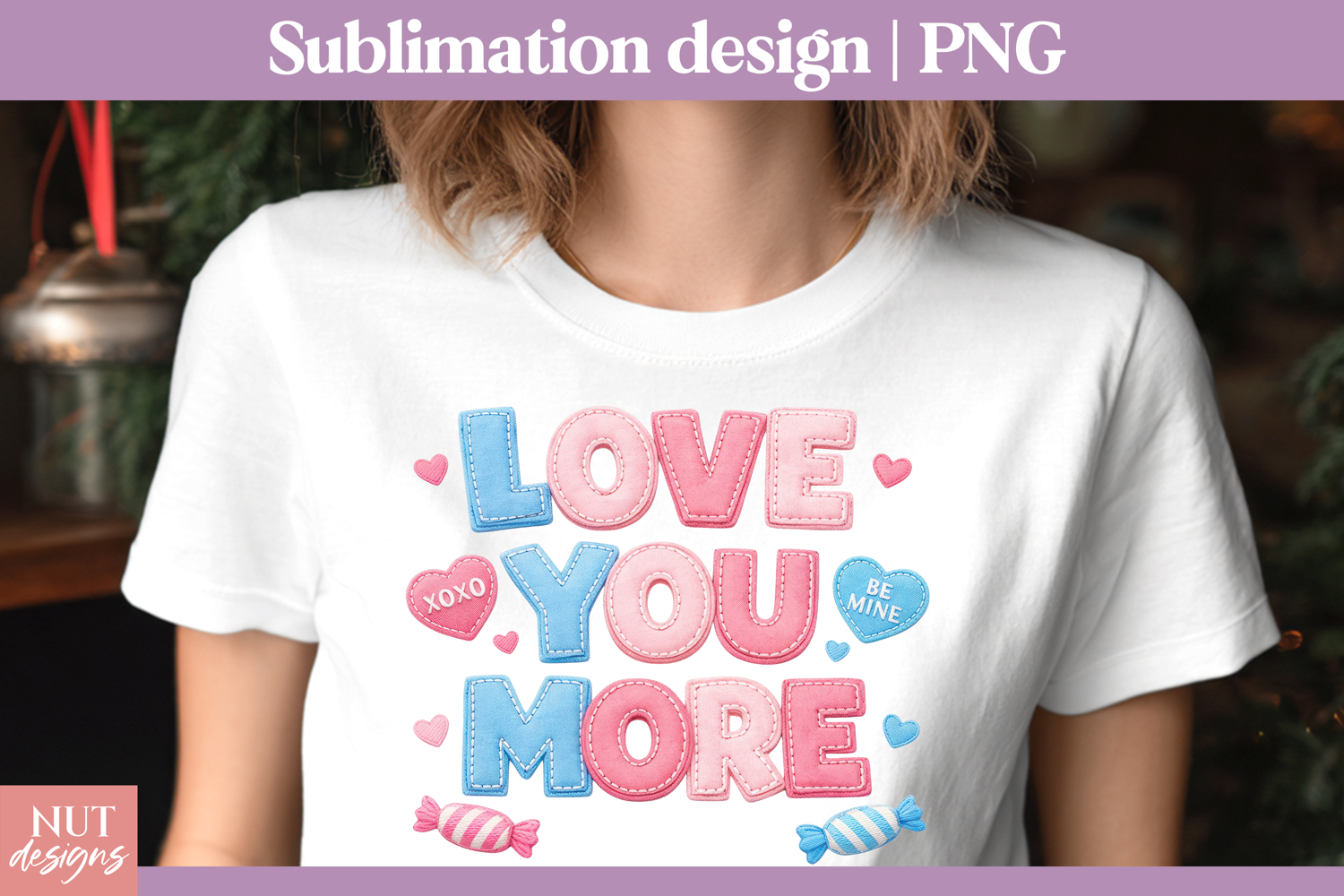 This "Love You More" sublimation PNG design features stitched pastel letters in pink and blue, accented with candy hearts, sweet treats, and romantic words like "XOXO" and "Be Mine." Perfect for Valentine's Day shirts, couple apparel, or handmade gifts, this high-resolution file adds a playful and heartfelt vibe to your DIY projects. Ideal for creating cute and colorful holiday fashion with a soft, loving message everyone will adore.