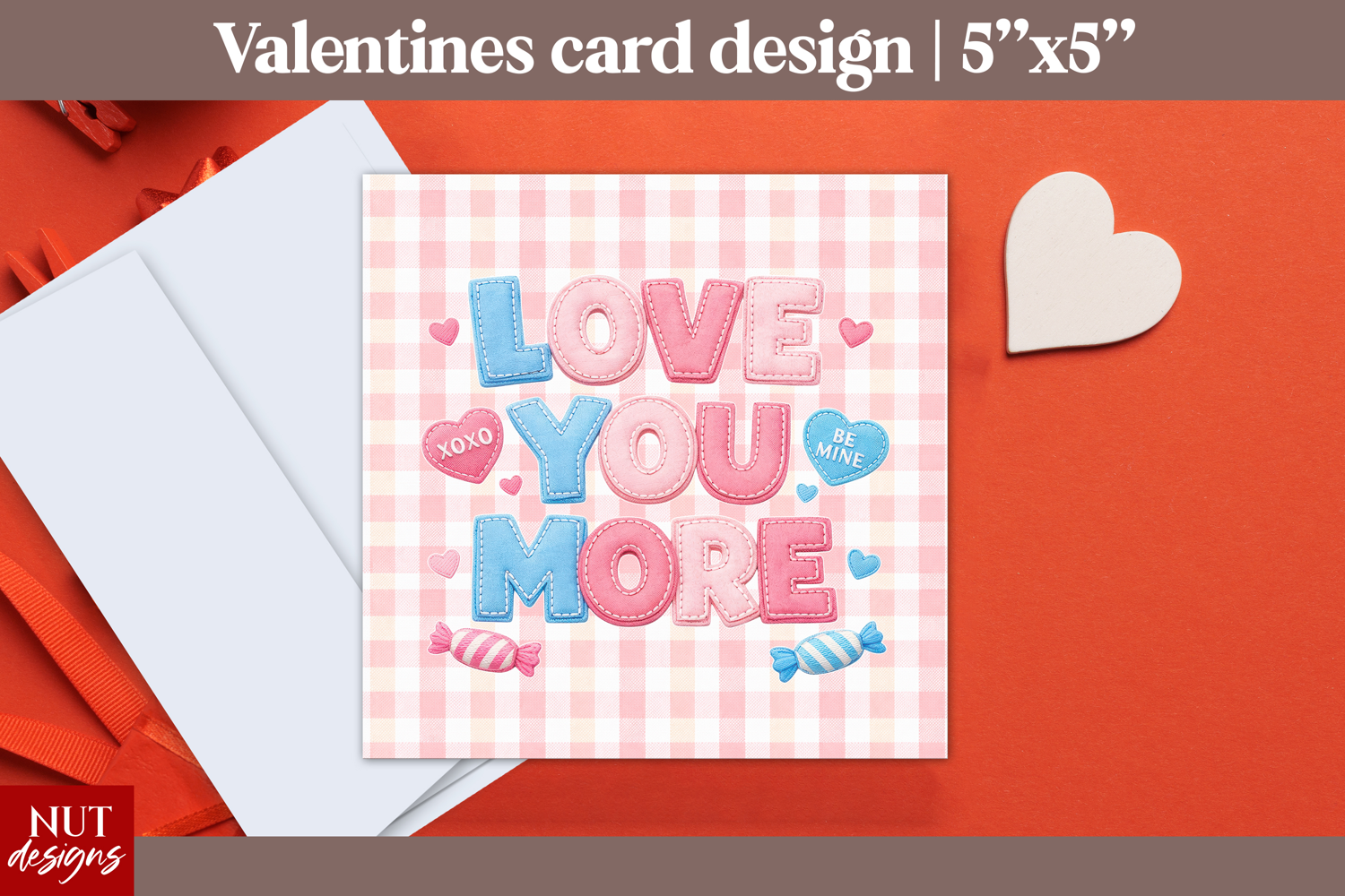 This "Love You More" valentine card design features stitched lettering in pink and blue, surrounded by candy hearts and sweet icons on a pink gingham background. Perfect for printable greeting cards, romantic messages, or heartfelt Valentine’s Day gifts, this design captures the charm of affection and fun. With cute candy elements, stitched textures, and a soft romantic palette, it’s an ideal choice for crafters creating personalized cards and digital valentines.
