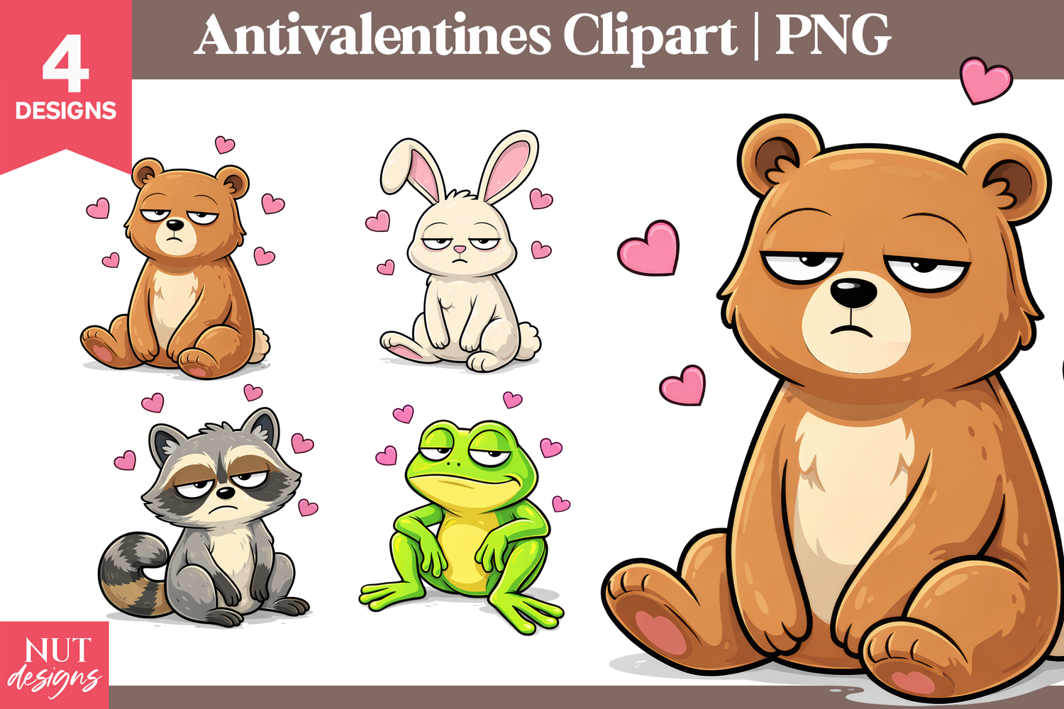 This Antivalentine clipart PNG bundle features four adorably annoyed animals: a bored bear, unimpressed bunny, sarcastic frog, and grumpy raccoon, all surrounded by floating hearts. Perfect for humorous or anti-love Valentine’s Day projects, cards, and printables. These expressive cartoon animals bring sass and personality to your crafts. Ideal for those who prefer humor and sarcasm over sentiment, this bundle delivers attitude with cute and minimalistic animal charm.