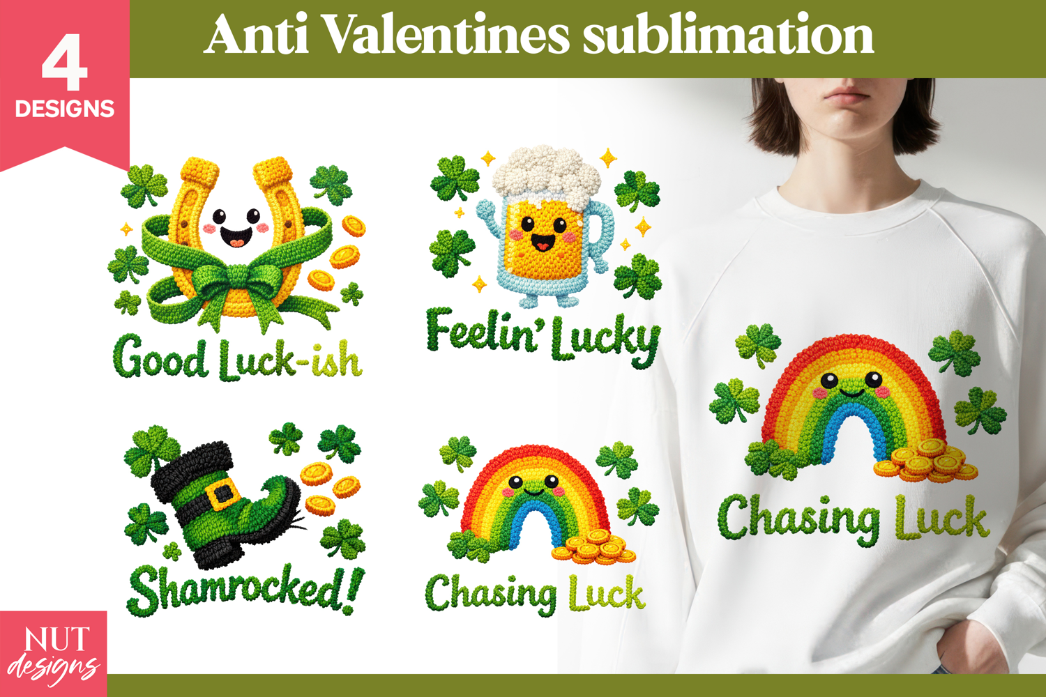 Celebrate St. Patrick’s Day with this adorable crochet-style sublimation PNG bundle! Featuring yarn-textured designs like a smiling rainbow, shamrock boot, lucky beer mug, and cheerful horseshoe, each graphic is perfect for festive shirts, mugs, and crafts. With sayings like “Shamrocked!” and “Chasing Luck,” these cute and colorful crochet cliparts bring Irish charm and humor to your holiday projects. Ideal for crafters who love yarn, stitches, and playful holiday vibes.