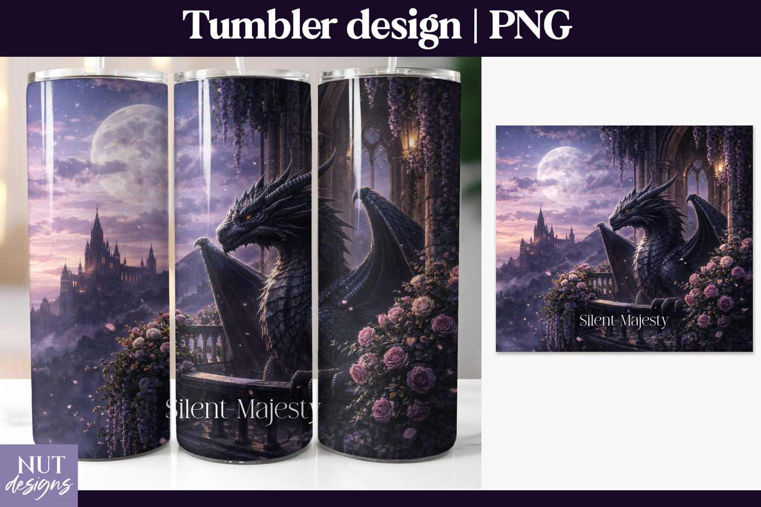 This gothic castle dragon tumbler wrap PNG captures a majestic dragon resting on a floral balcony under a glowing moon, with a distant castle silhouetted in a dreamy twilight sky. Surrounded by cascading roses and gothic arches, this design evokes elegance and fantasy. Perfect for sublimation and printable projects, it blends magic, mystery, and floral charm. Keywords include dragon, gothic, castle, moon, purple, majestic, flowers, elegant, wrap, and fantasy scene.