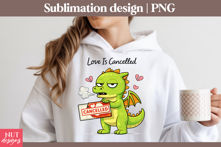 This “Love Is Cancelled” PNG design features a grumpy cartoon dragon holding a CANCELLED sign, surrounded by broken hearts and moody vibes. Perfect for anti-Valentine’s Day crafts, sarcastic apparel, or humorous digital projects, this sassy green dragon brings personality and attitude. Ideal for those embracing single life or looking to make a bold statement. Comes as a high-quality transparent PNG, ready for sublimation on hoodies, mugs, and more.