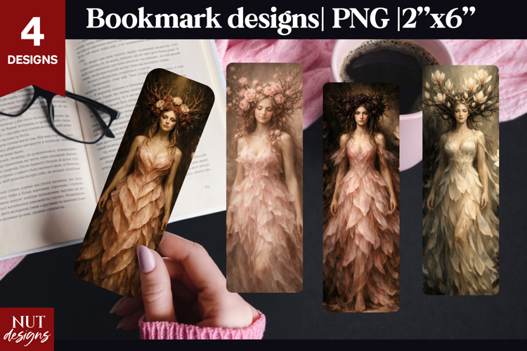 Embrace the charm of nature with these fantasy woodland lady bookmarks, showcasing ethereal women in flowing petal-like gowns, crowned with flowers and branches. These 2"x6" PNG designs evoke a rustic, magical feel perfect for fantasy lovers, nature-inspired journaling, or digital projects. Each bookmark blends earthy tones, floral elements, and serene feminine beauty, making them ideal for those who adore elegant, mystical, and woodland-inspired designs with vintage flair.
