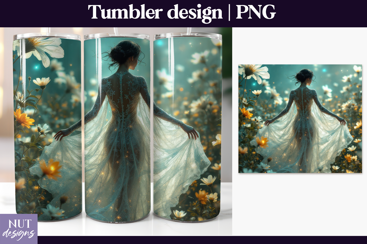 This enchanted garden lady tumbler design features a graceful woman in a glowing lace gown surrounded by blooming flowers and soft sparkles. Perfect for lovers of dreamy, floral, and fantasy-inspired designs, it brings elegance, serenity, and shimmer to your creations. With elements like glitter, teal tones, and magical lighting, this design adds a fairytale touch to sublimation projects. Ideal for romantic, feminine, and ethereal crafting themes.