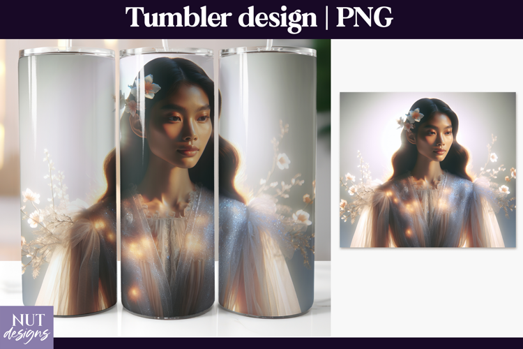 This Radiant Floral Glow tumbler design features a graceful woman adorned in a softly glowing gown surrounded by delicate floral accents and warm sparkles. The pastel hues and serene expression create a dreamy, ethereal atmosphere perfect for elegant fantasy themes. Ideal for crafters seeking a luminous and calming design, this wrap brings a peaceful, goddess-like beauty and soft floral charm to your sublimation projects.