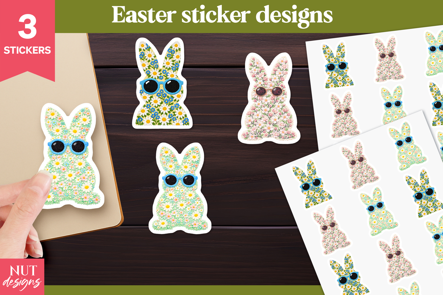Stickers Easter Stickers Floral Bunny Bunny With Sunglasses Floral Easter Bunny Knitted Easter Bunny Crochet Easter Spring Bunny Sticker Cute Easter Bunny Sticker Pastel Easter Rabbit