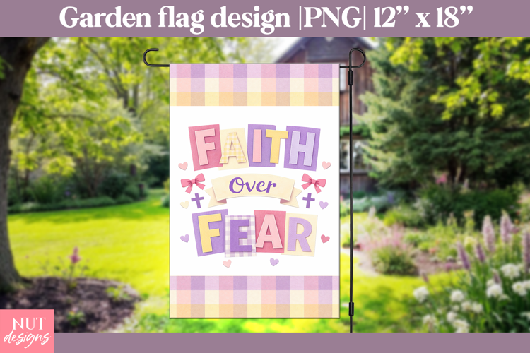 This Faith Over Fear garden flag PNG features soft pastel colors, playful lettering, hearts, bows, and cross accents with a cheerful plaid border. Sized at 12x18 inches, it’s perfect for creating Christian garden flags, porch decor, and outdoor displays. Ideal for spring decorating, this uplifting design blends beautifully with cottage and farmhouse styles while sharing a powerful message of faith, trust, and encouragement rooted in Christian belief.