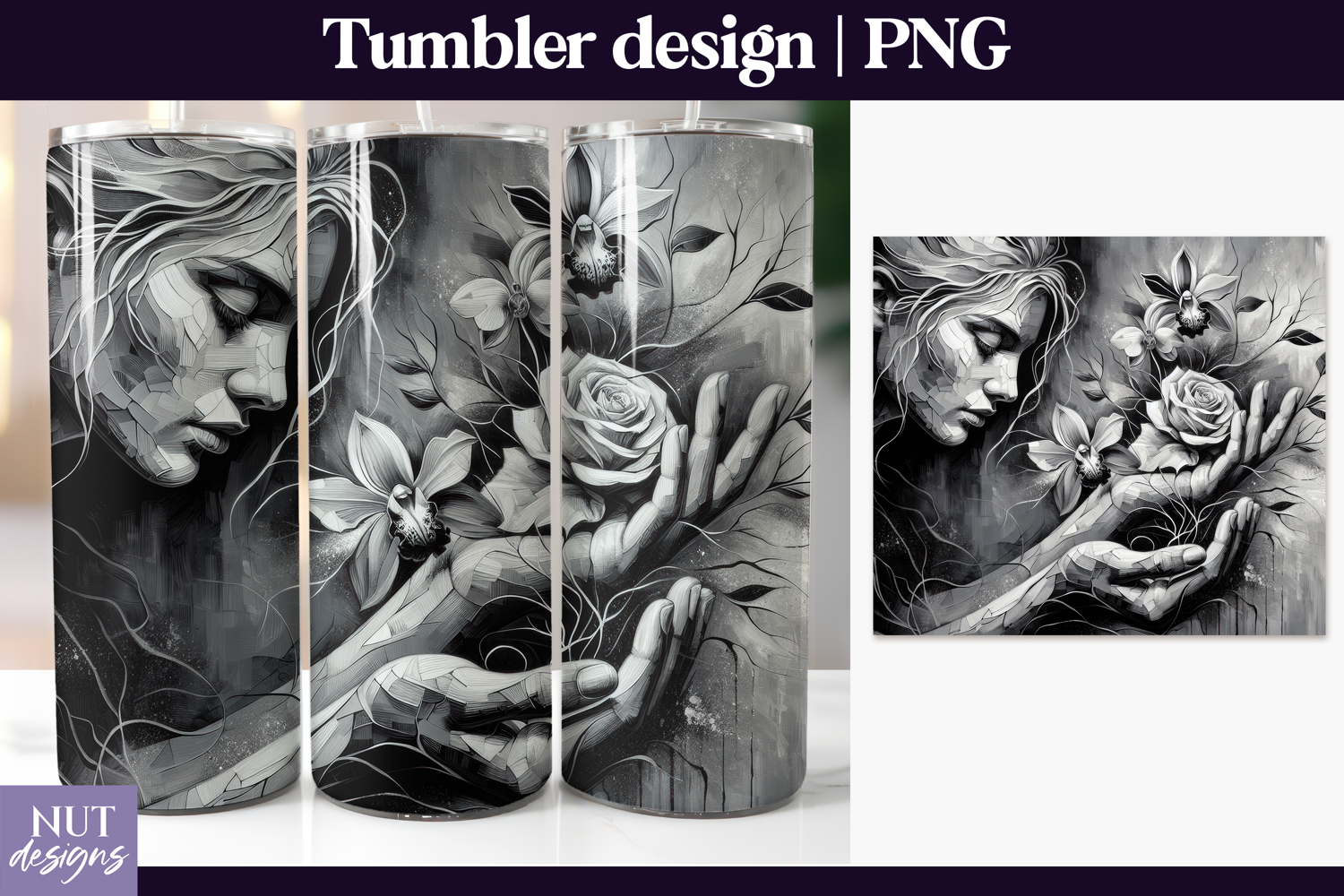 This gothic floral woman tumbler PNG features a dramatic monochrome portrait surrounded by roses and flowing botanical details. The elegant grayscale style blends dark fantasy, floral beauty, and mystical emotion, making it perfect for sublimation tumblers and creative crafting projects. With a moody aesthetic, feminine energy, and detailed illustration, this printable PNG is ideal for crafters looking for gothic, romantic, and floral designs that stand out.