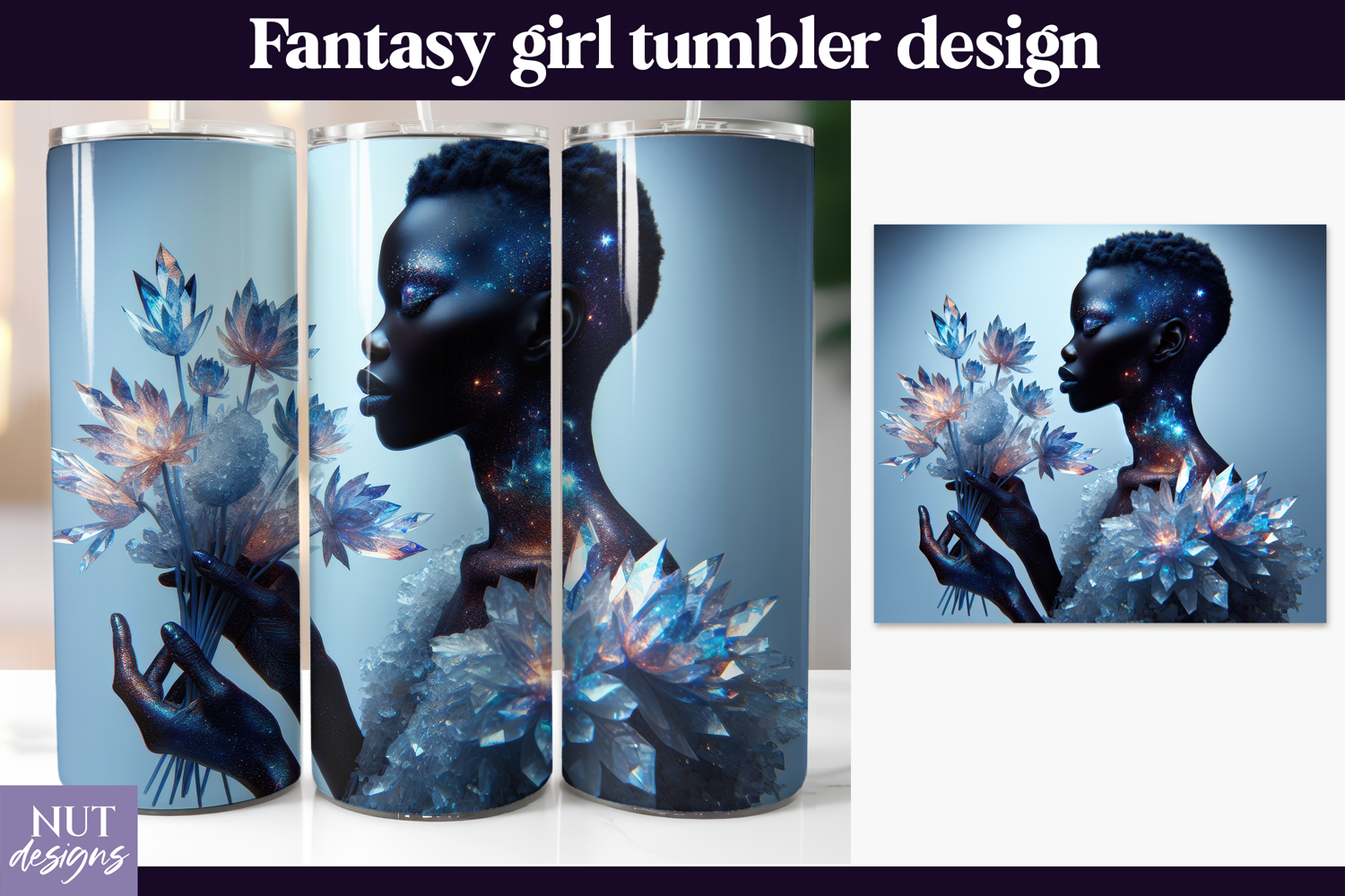 This Cosmic Crystal Goddess tumbler wrap PNG features a breathtaking fantasy portrait with galaxy-kissed skin, shimmering stardust details, and radiant crystal flowers glowing in cool blue and indigo tones. Designed for 20oz skinny tumblers, this sublimation wrap creates a bold celestial drinkware design filled with mystical sparkle and ethereal beauty. Perfect for fantasy lovers, this high-quality digital download adds elegant cosmic charm to custom tumblers and handmade gifts.Perfect for sublimation of skinny 20oz tumblers. 9.3''x8.2''inches (2790 px x 2460 px).
