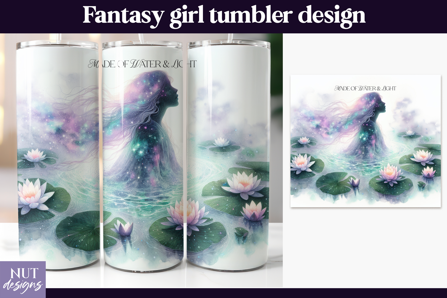 This Galaxy Lotus Woman tumbler wrap PNG features a dreamy fantasy silhouette filled with swirling nebula colors in teal, mint, purple, and soft pink. Surrounded by glowing lotus flowers floating on a tranquil watercolor pond, this celestial design blends cosmic stardust and spiritual elegance. Perfect for 20oz skinny tumblers, this high-resolution sublimation wrap is ideal for creating magical drinkware with a soft aesthetic and fantasy girl charm.