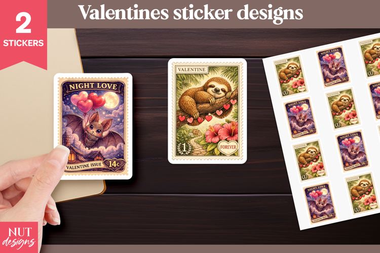 Vintage Valentine Animal Stickers PNG features two charming postage style designs with a sweet bat holding heart balloons and a relaxed sloth surrounded by flowers and love accents. These high resolution printable stickers are perfect for Valentine cards, planner decor, scrapbooking, Cricut and Silhouette projects, and romantic DIY crafts. Add nostalgic stamp inspired charm to journals, handmade gifts, and February holiday creations with this adorable animal set.
